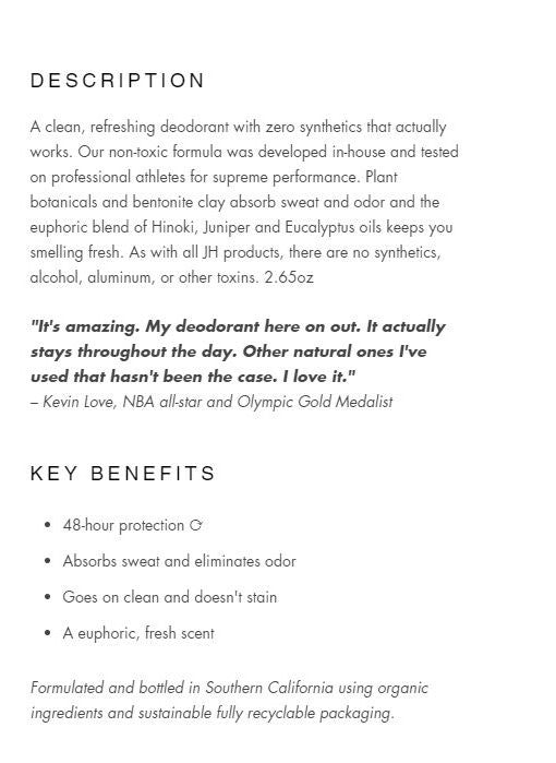 A long-lasting functional deodorant containing probiotics, enzymes, and plant extracts to trap, neutralize and eliminate body odor. made free of baking soda, this formula is ph balancing, gentle on underarms and provides all day protection.